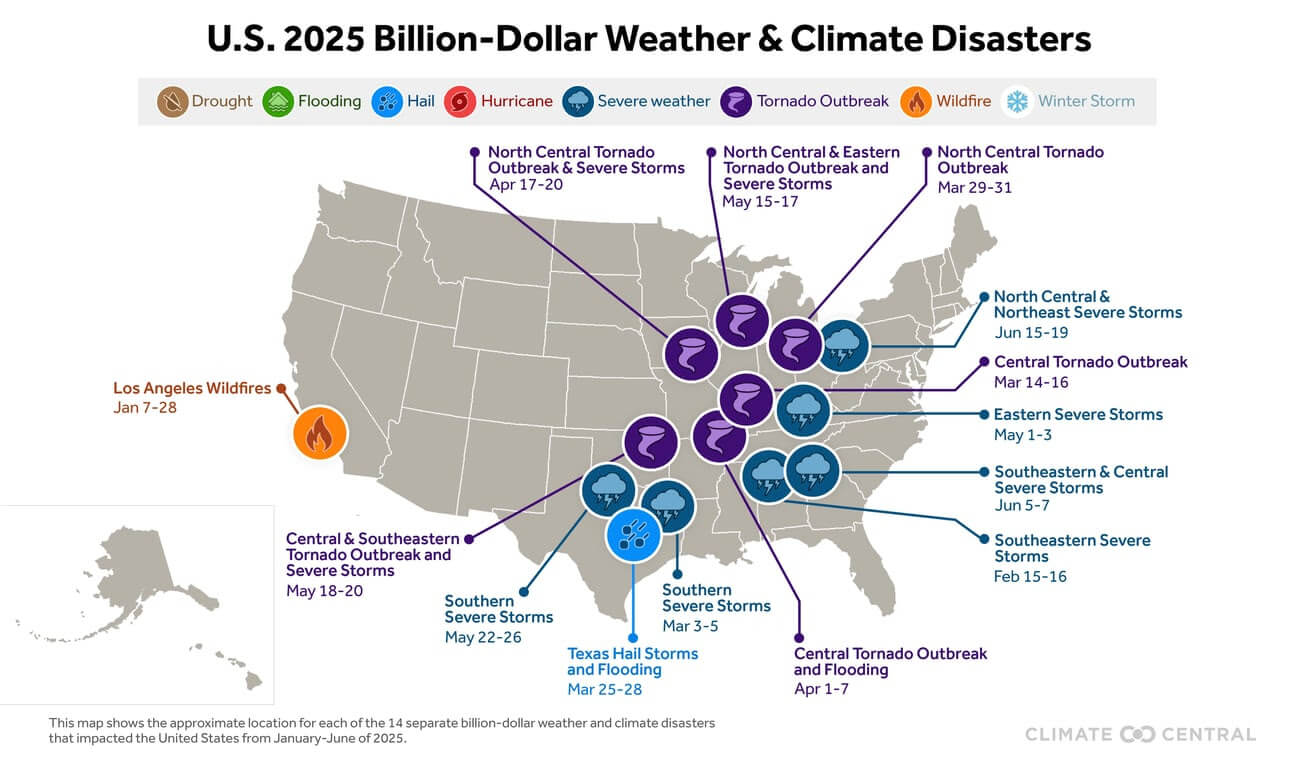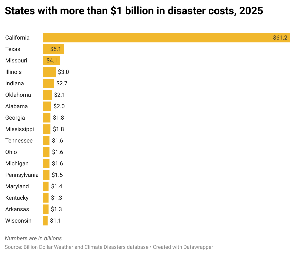 In the first six months of 2025, there were 14 disasters with damages costing just over $101 billion in total. Many of them occurred throughout the Mississippi River Basin. Mississippi, where storms have caused $1.8 billion in damage, Illinois, Missouri, Arkansas and Tennessee were among the hardest hit by severe storms and tornadoes, which caused just over $40 billion in damage.