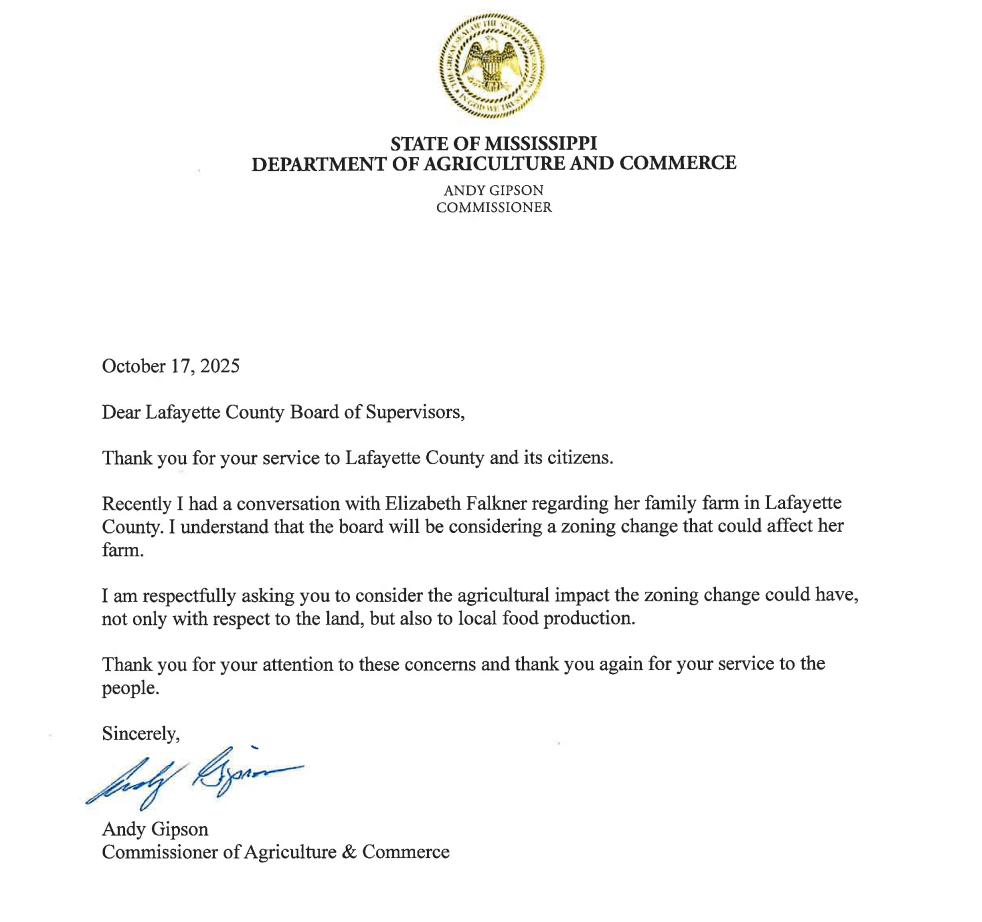 Agriculture Commissioner Andy Gipson visited the Falkner family last week and shared photos of the visit on social media. In a letter to the Lafayette County Board of Supervisors, Gipson asked the Board “to consider the agricultural impact the zoning change could have.”