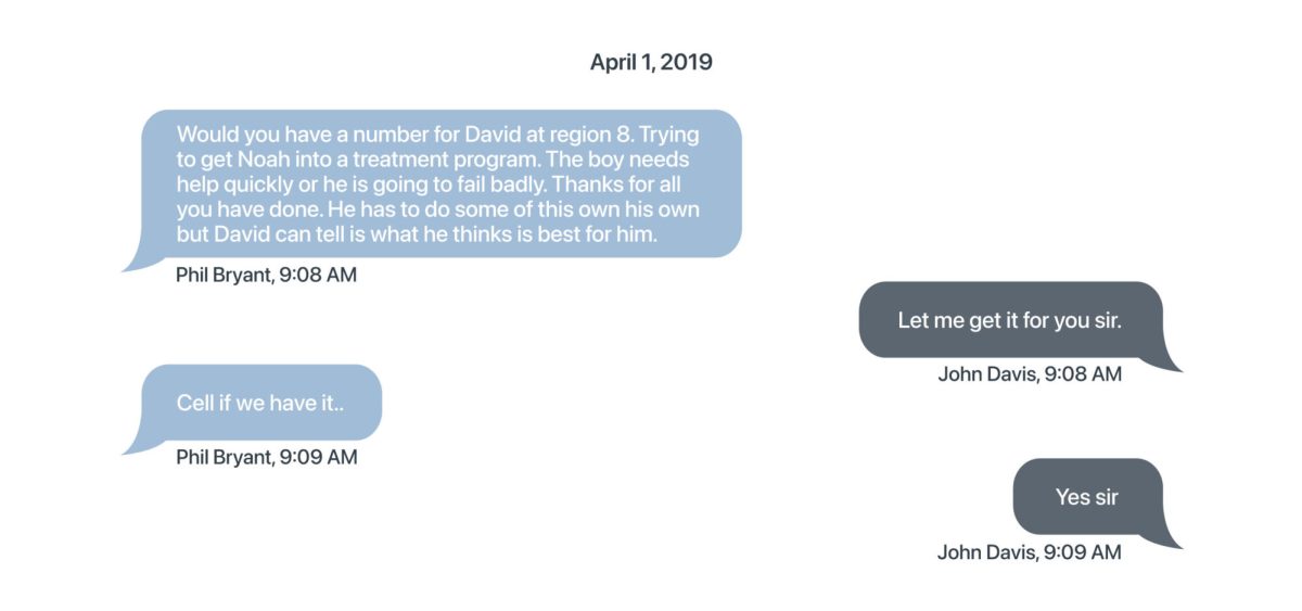 “Would you have a number for David at Region 8. Trying to get Noah into a treatment program,” Bryant wrote on April 1. “The boy needs help quickly or he is going to fall badly. Thanks for all your have done. He has to do some of this own his own but David can tell is what he thinks is best for him.”