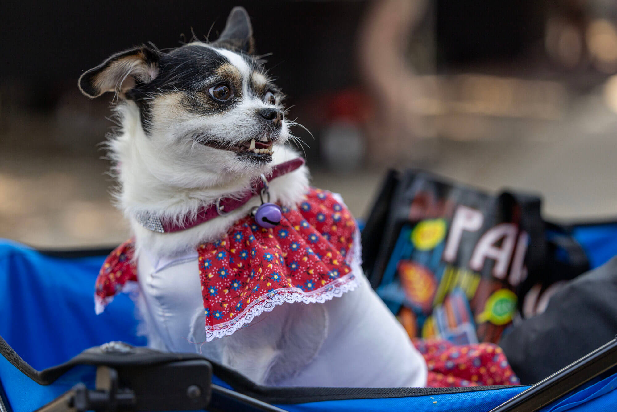 A dog wears a festive costume during the during the Festival Hispano de Pascagoula at Beach Park in Pascagoula, Miss., on Saturday, Sept. 20, 2025. Credit: Eric Shelton/Mississippi Today