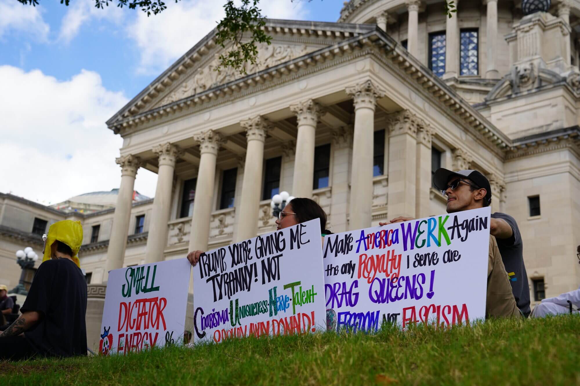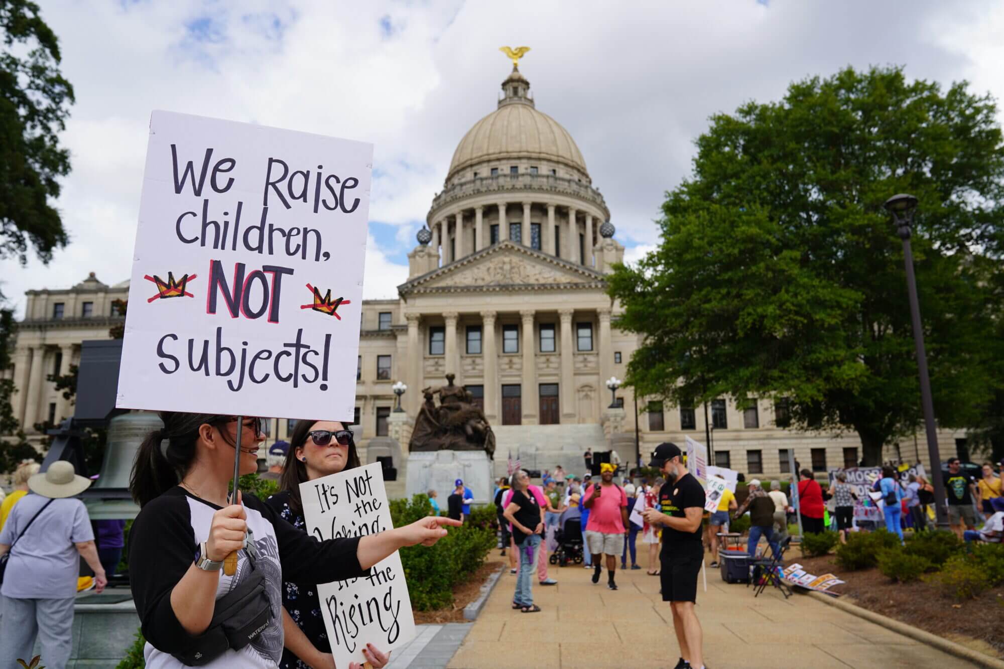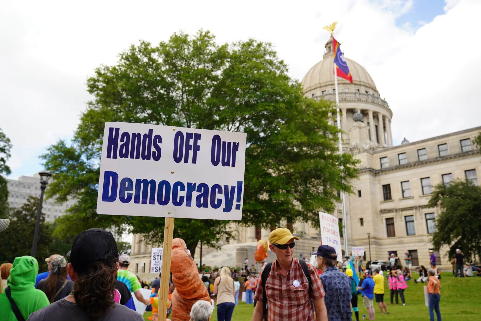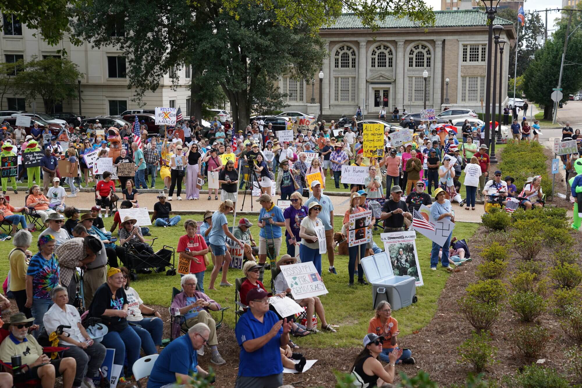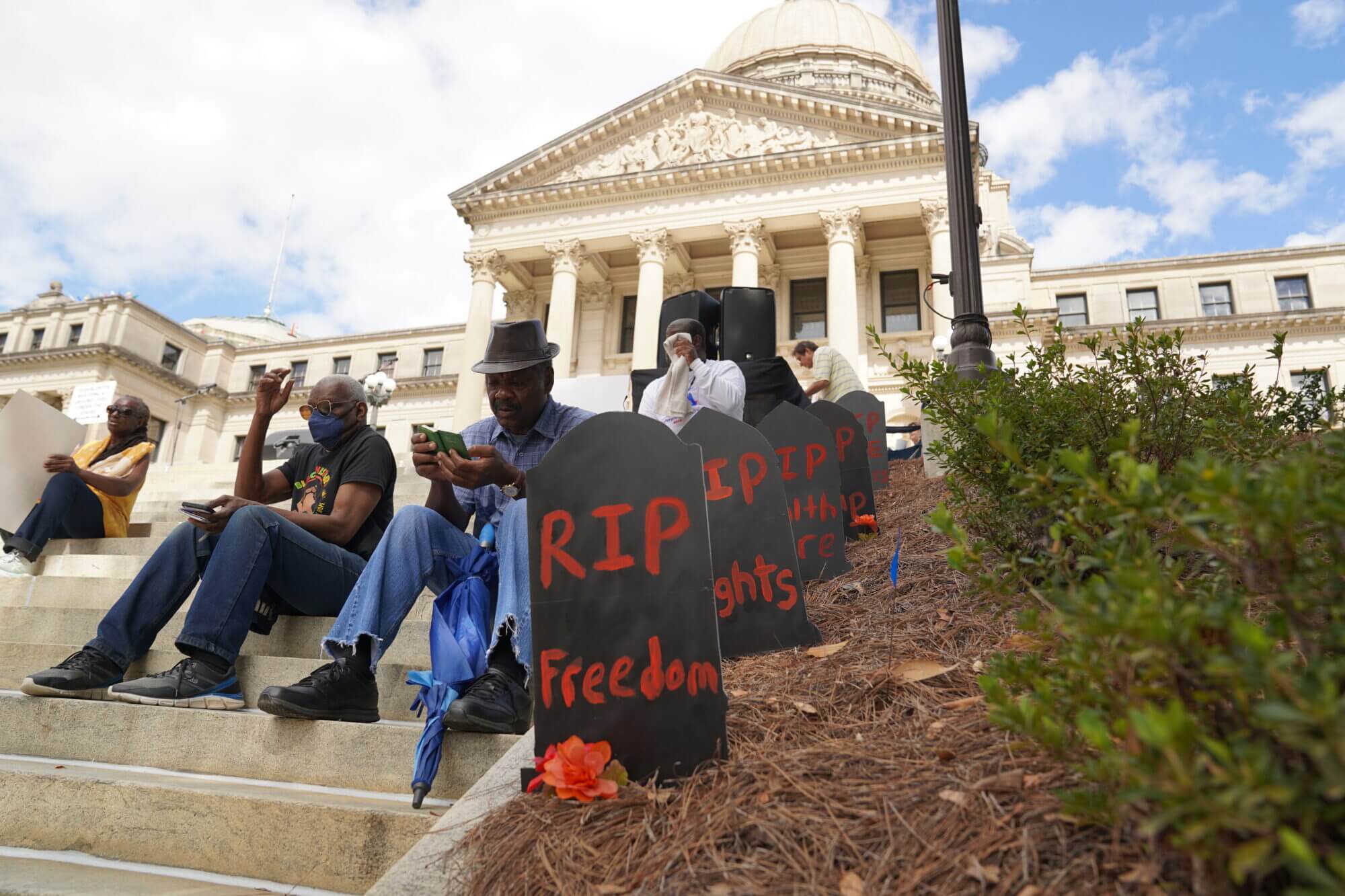 Hundreds of people at a rally on the south lawn of the Mississippi Capitol chanted, “Vote them out.”