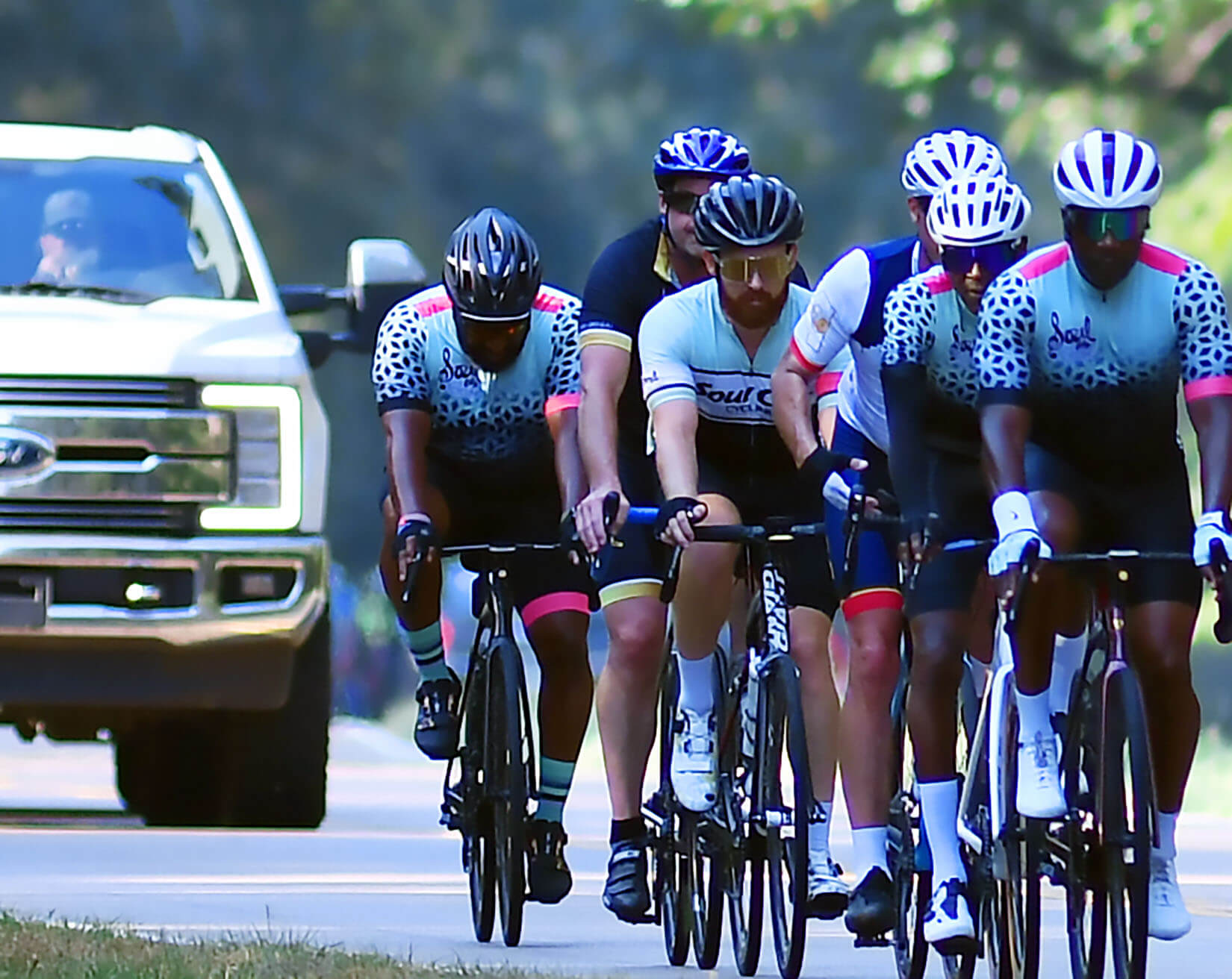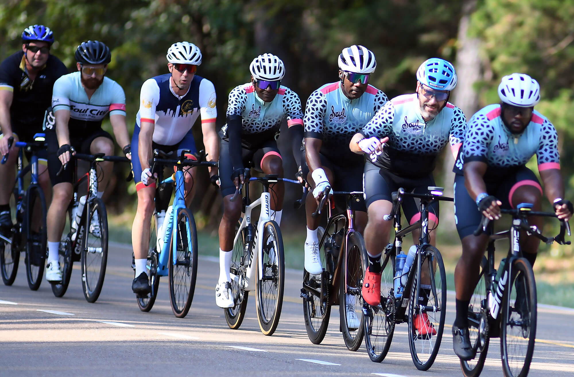Soul City Cycling and Major Taylor Cycling Club members cruise along the Natchez Trace in Madison County, Saturday, Sept. 20, 2025. Credit: Vickie D. King/Mississippi Today