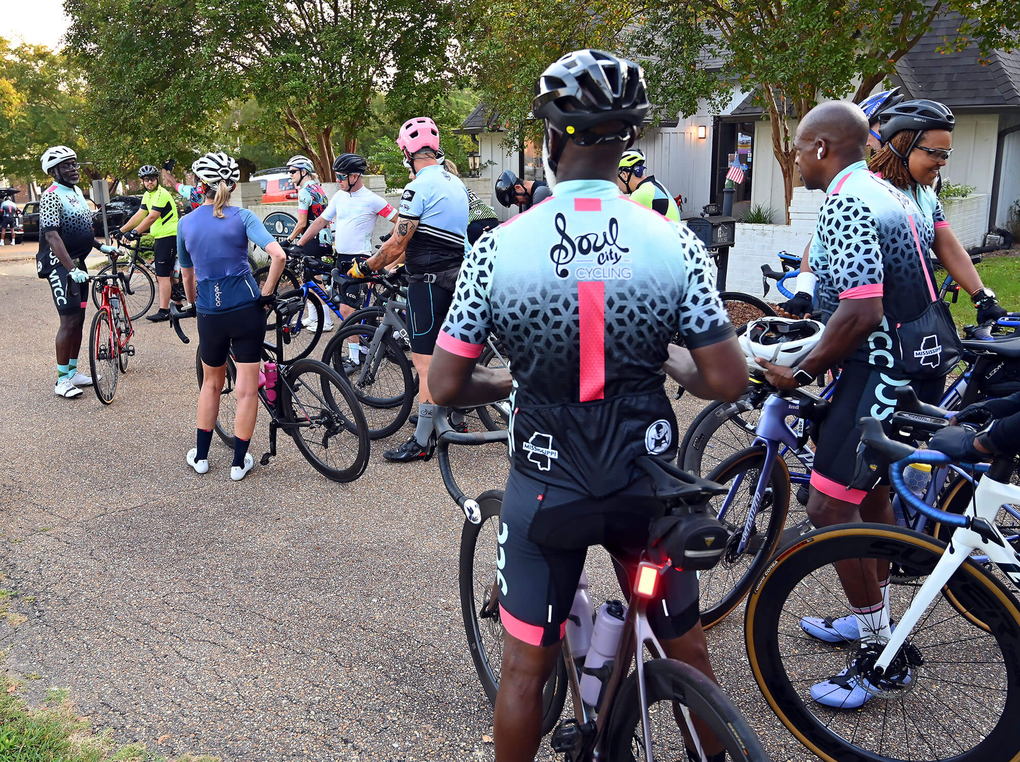 Soul City Cycling and Major Taylor Cycling Club members gather at The Bike Crossing in Ridgeland before the start of a 40-50 mile ride, Saturday, Sept. 20, 2025. Credit: Vickie D. King/Mississippi Today